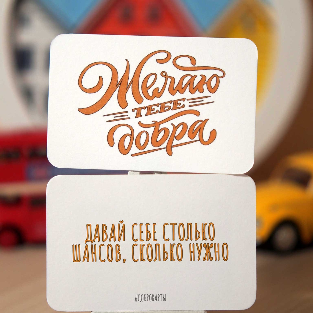 Доброкарты – это карты с позитивной надписью и рисунком на все случаи жизни. Они сделать из плотной и приятной на ощупь экобумаги и созданы специально для того, чтобы делиться добротой. На